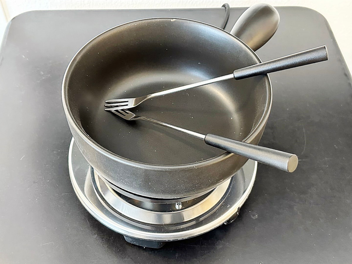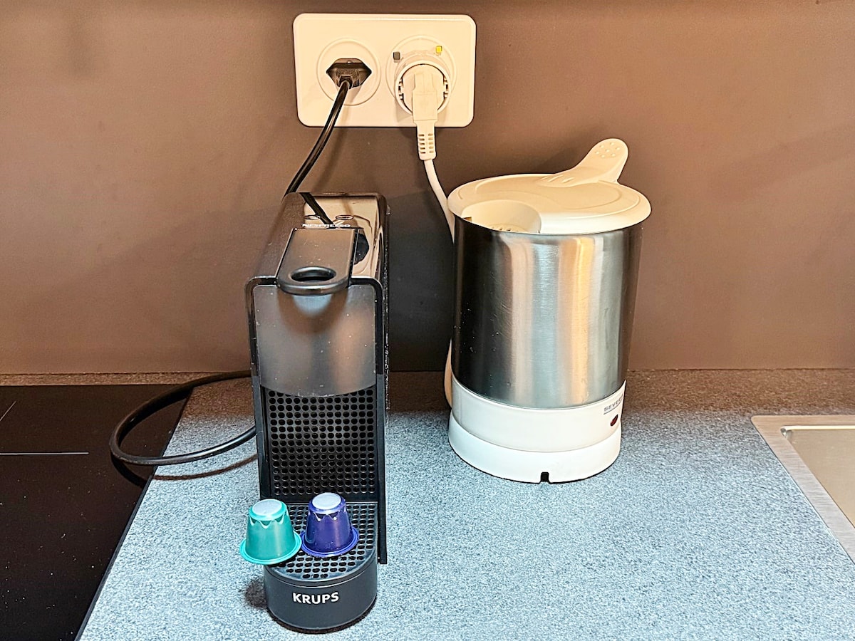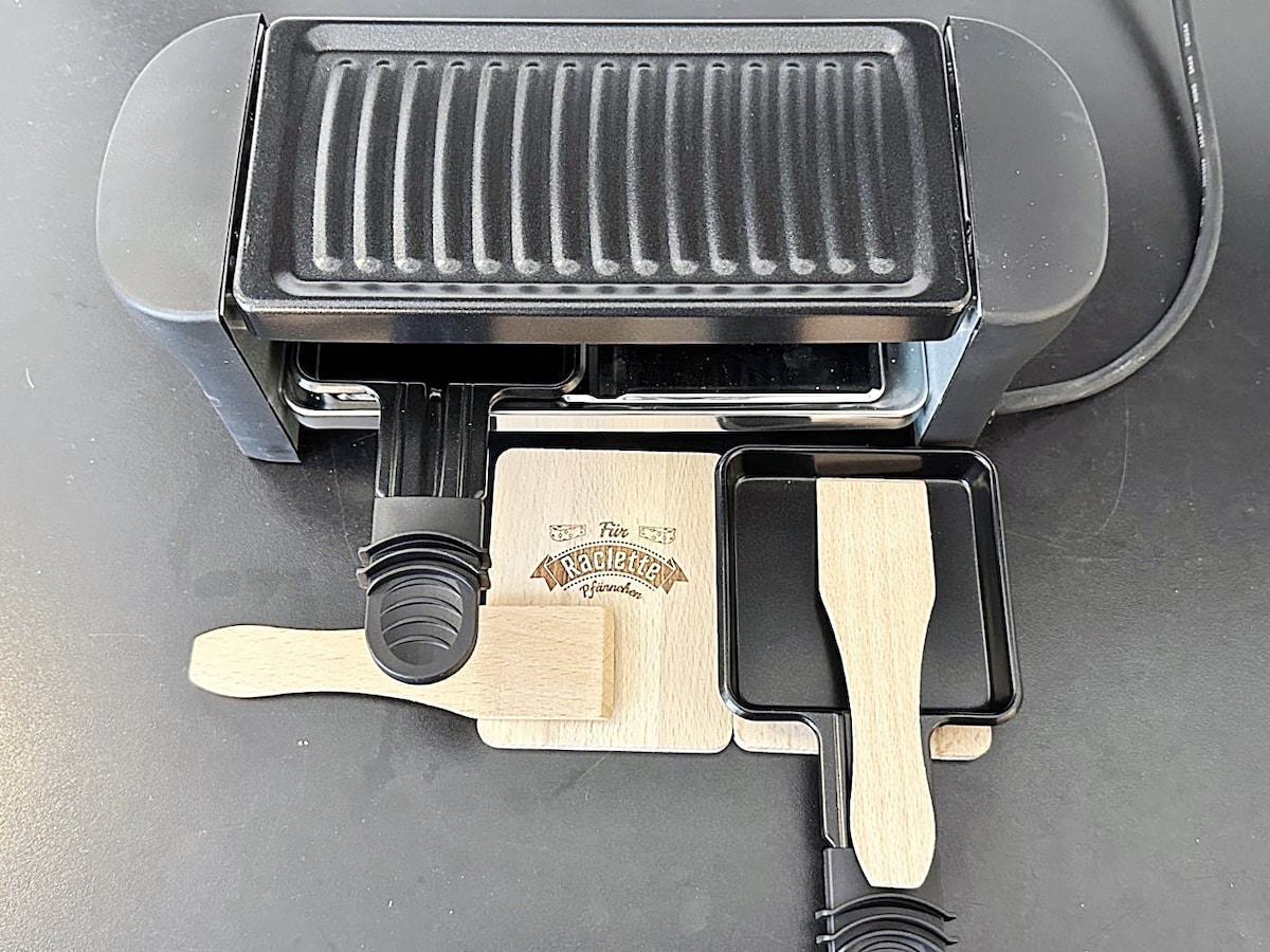 Coffee machine with free capsules. Kettle, toaster, fondue set, and raclette are provided.