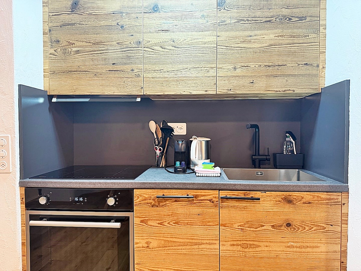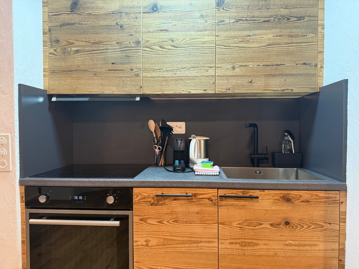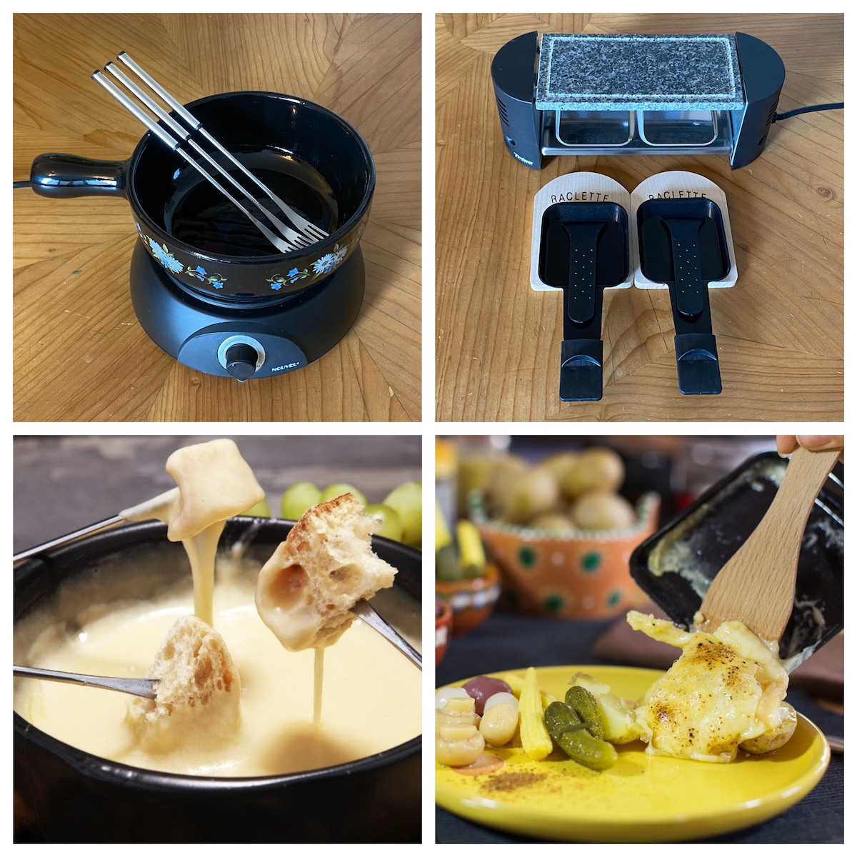 Coffee machine with free capsules. Kettle, toaster, fondue set, and raclette are provided.