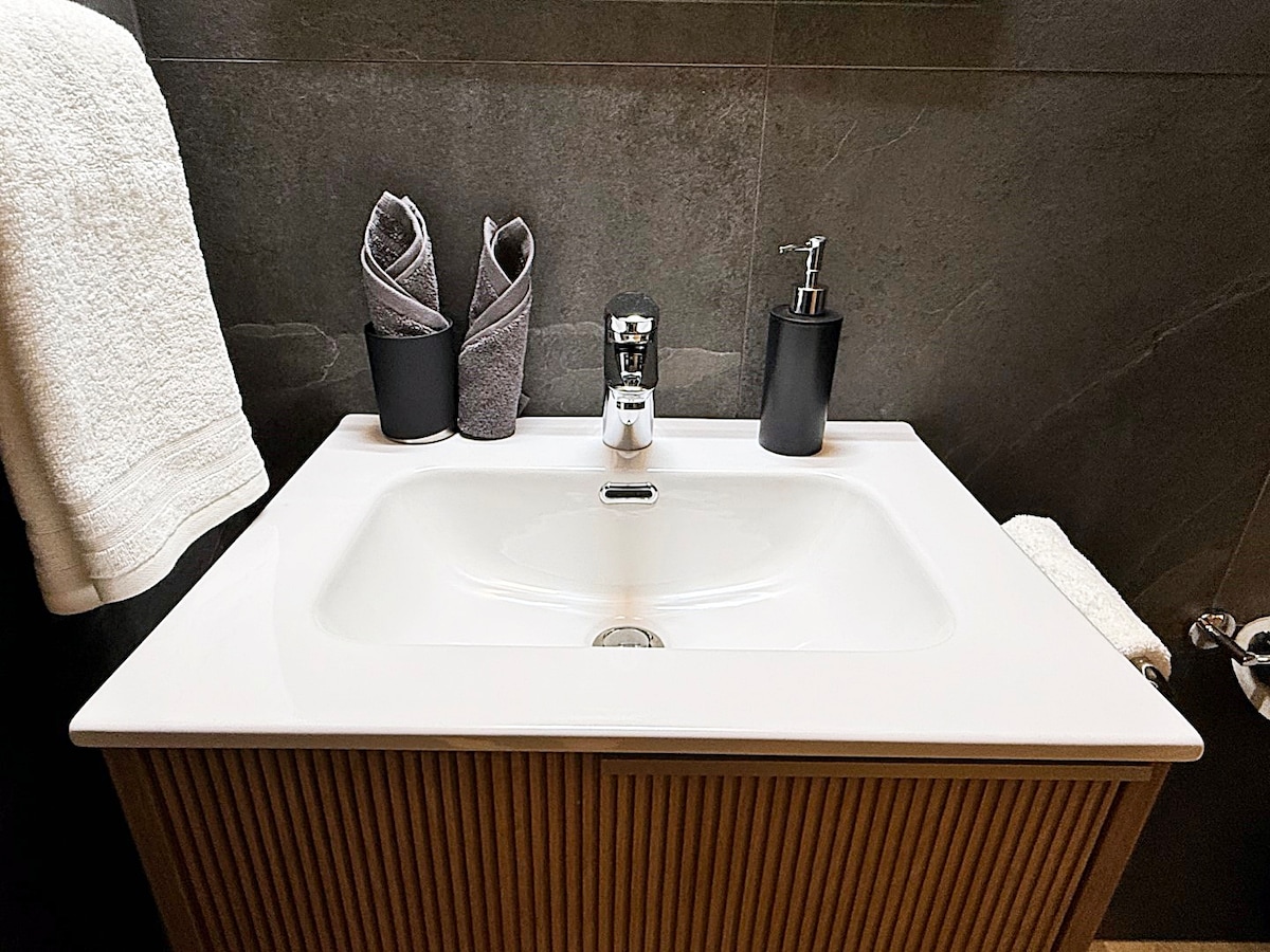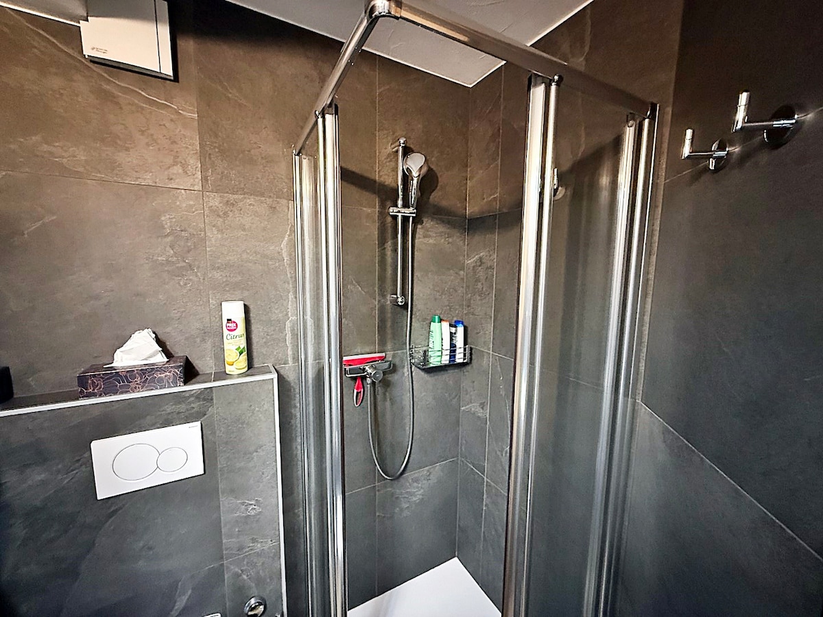 Bathroom with shower. Shampoo/shower gel and fluffy terry towels are provided.