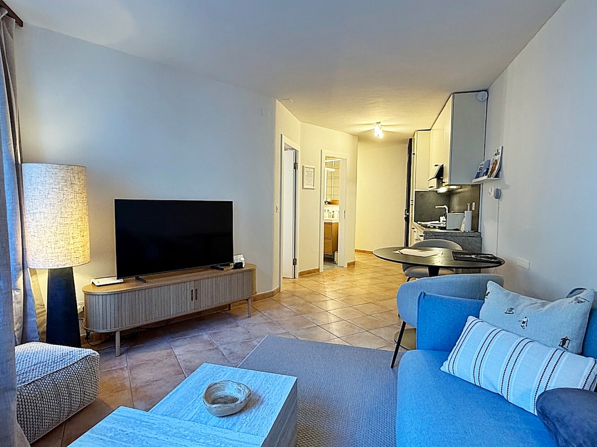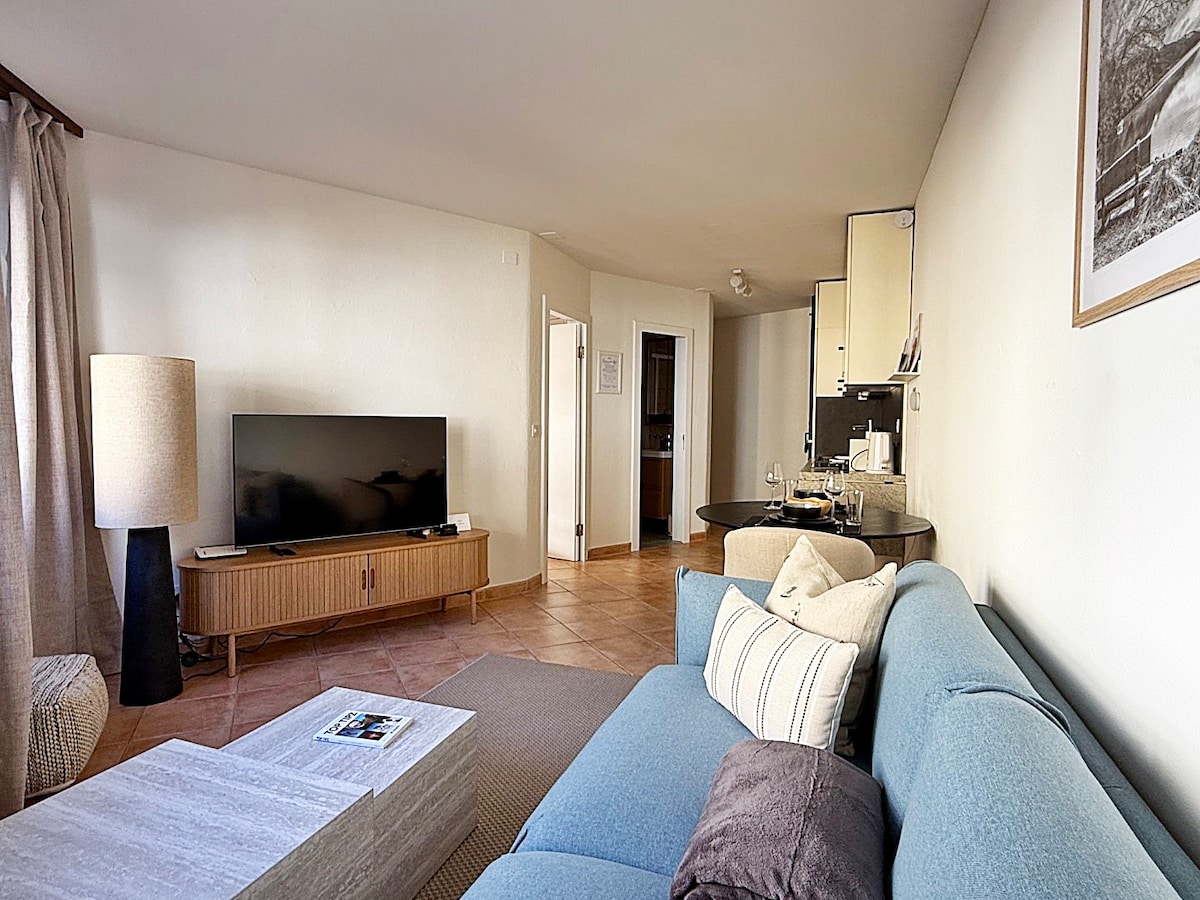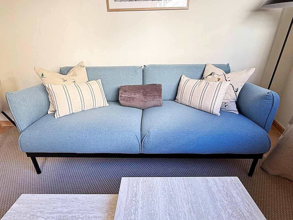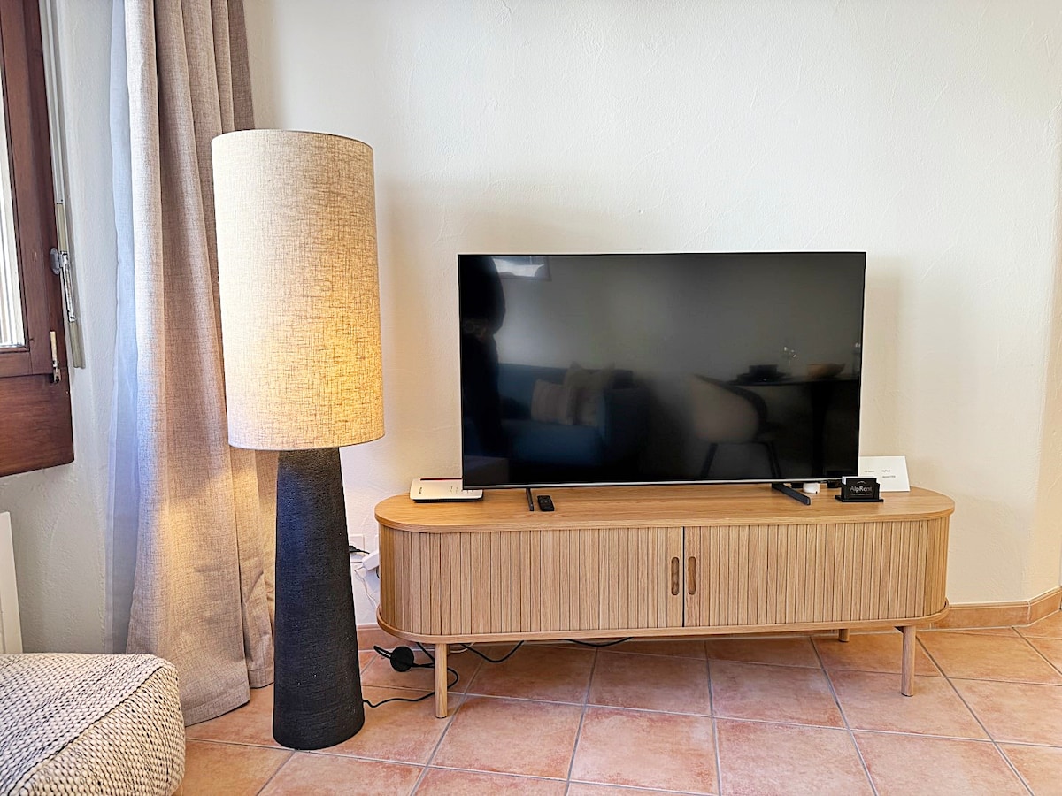 The spaceApartment No. 8 on the 2nd floor, 45 m², double bed (160 x 200) with white bed linen. Cozy living room with sofa, dining area, and large smart TV with over 120 multilingual channels.
