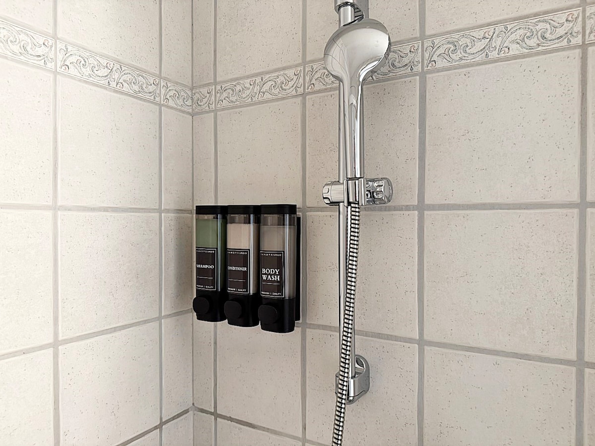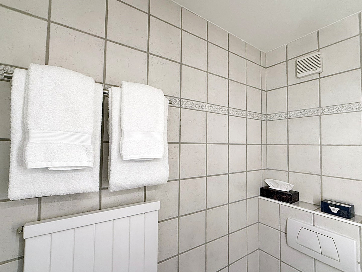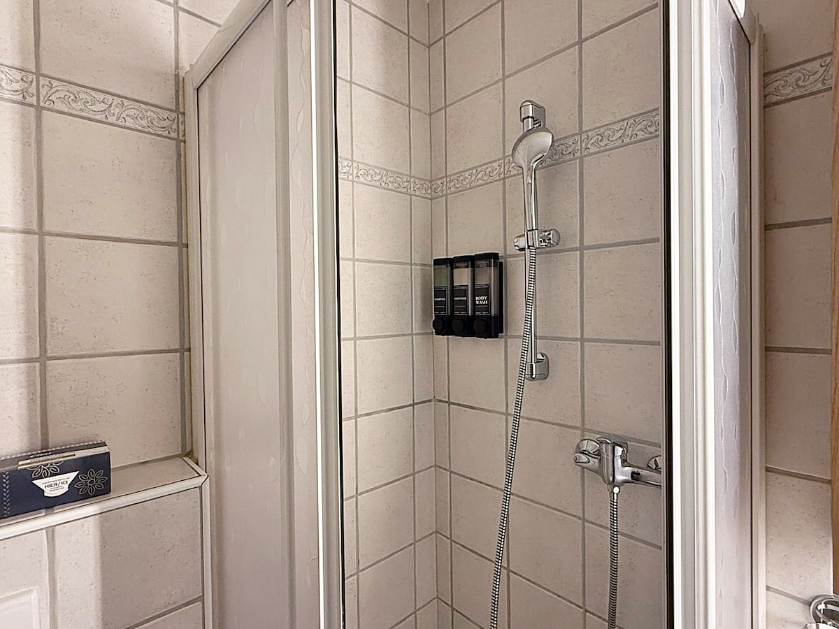 Bathroom with shower. Shampoo/shower gel and fluffy towels are provided.