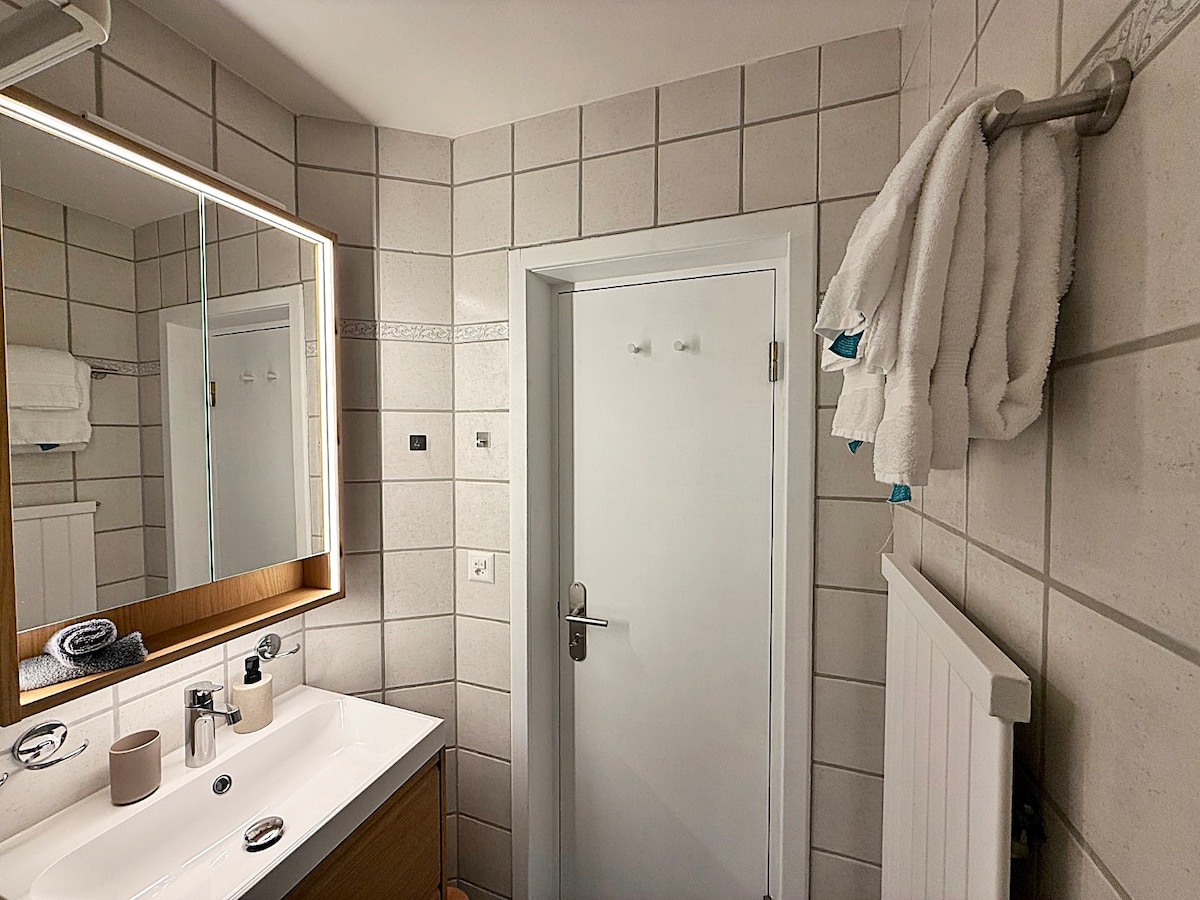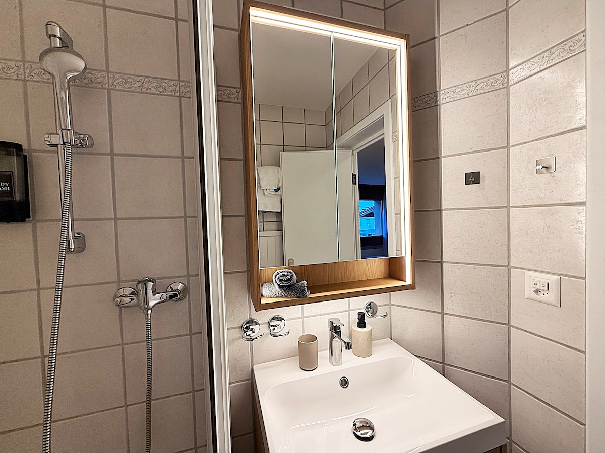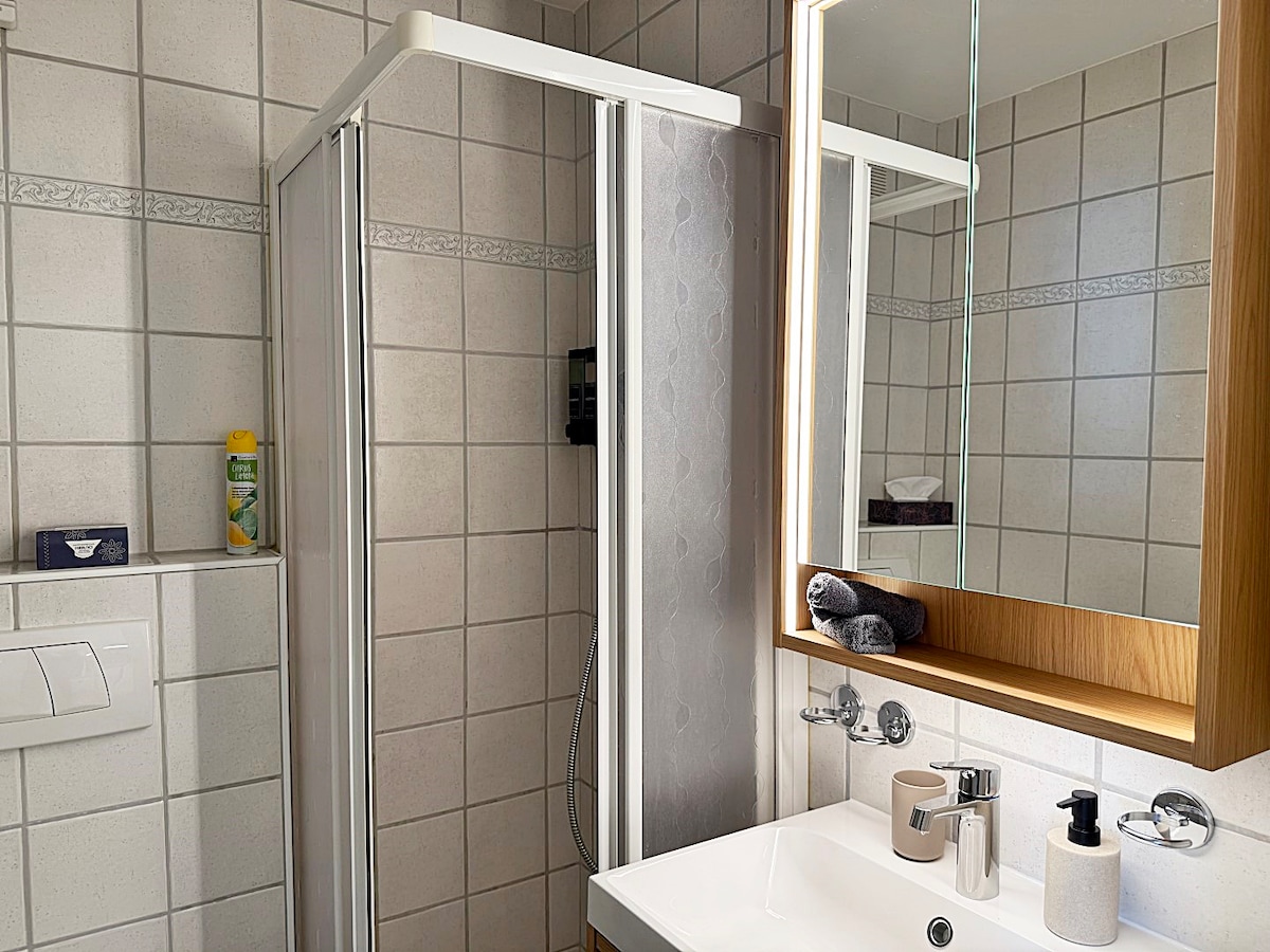 Bathroom with shower. Shampoo/shower gel and fluffy towels are provided.